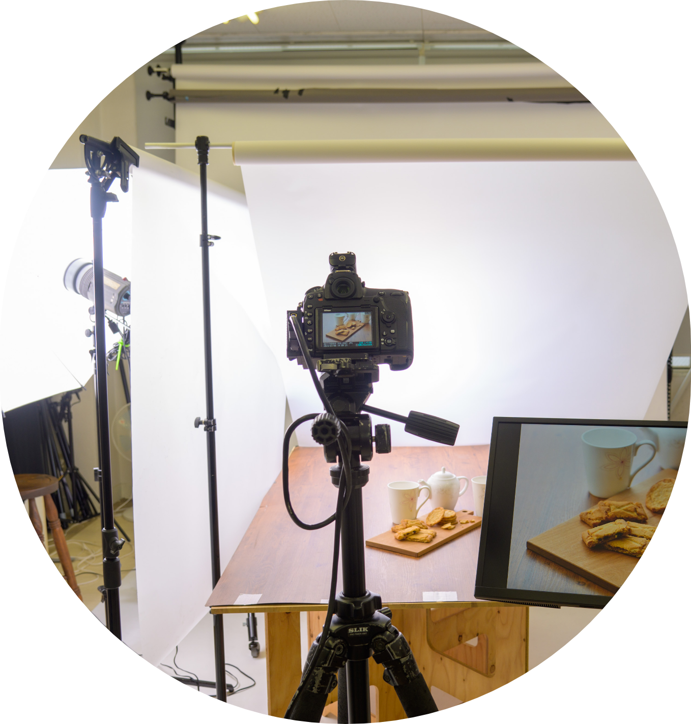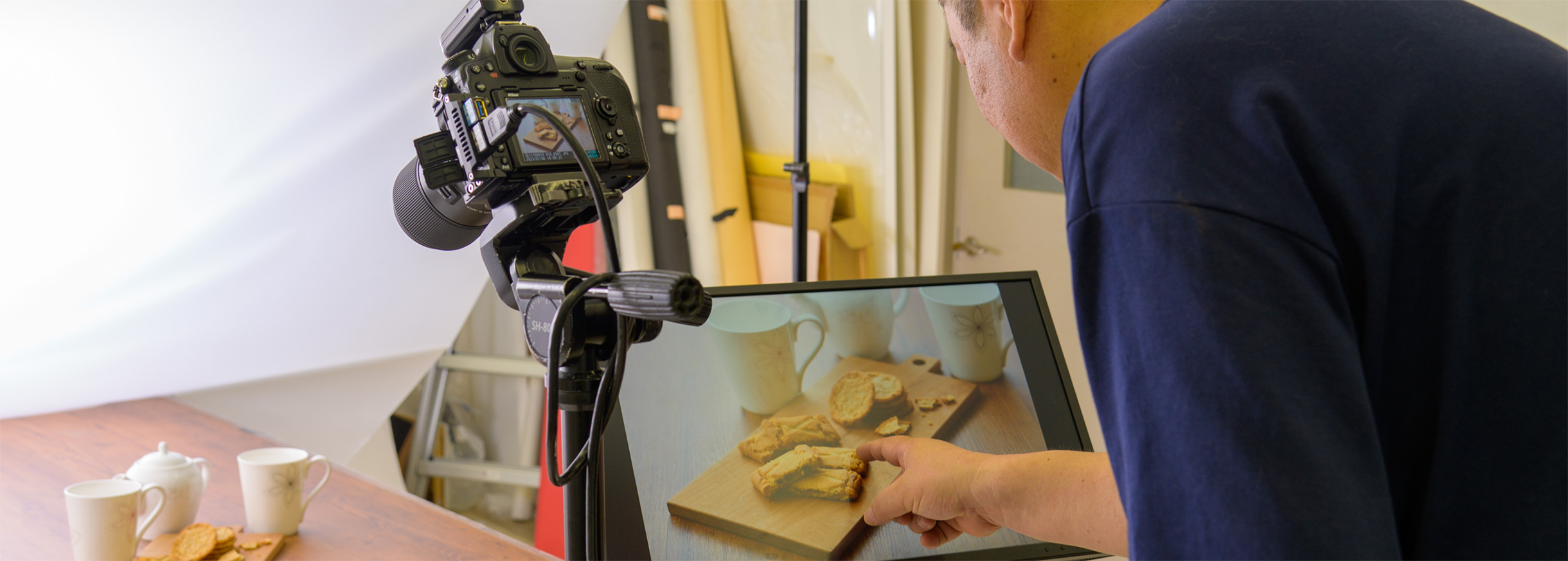 商品のコンセプトなどをヒアリングし、小物を使ってイメージを膨らませたり、飲み物を注ぐなど商品の良さを引き立たせるイメージを作って撮影。